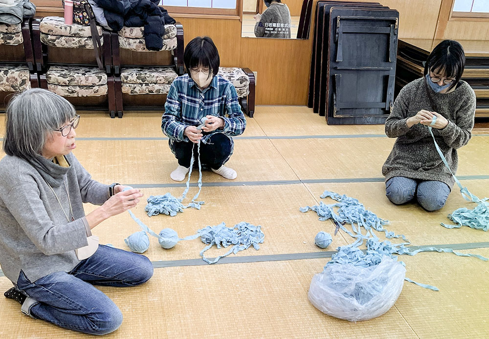 納品が終わったあとは、みんなでMOKUの捨て耳をくるくる丸める作業。