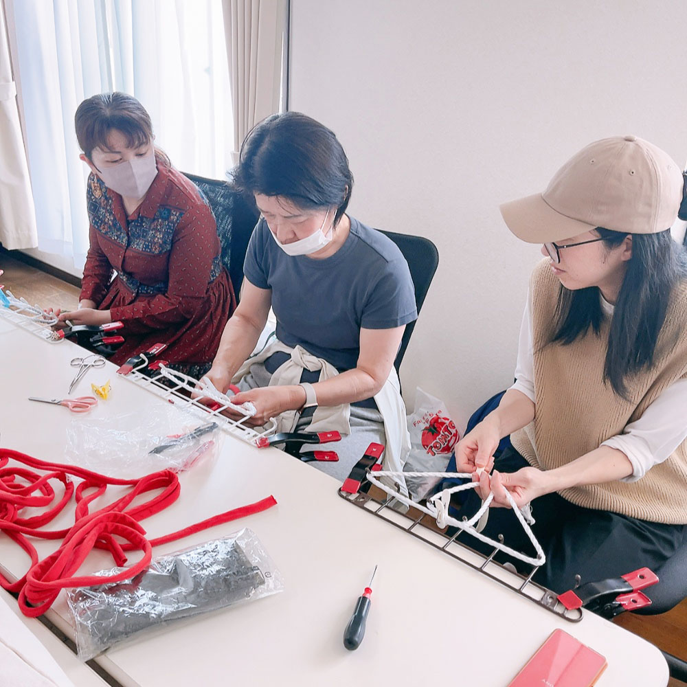 午前中は納品と布の裁断、午後はベテランの編み手さんによる技術指導・あみあみ会です!