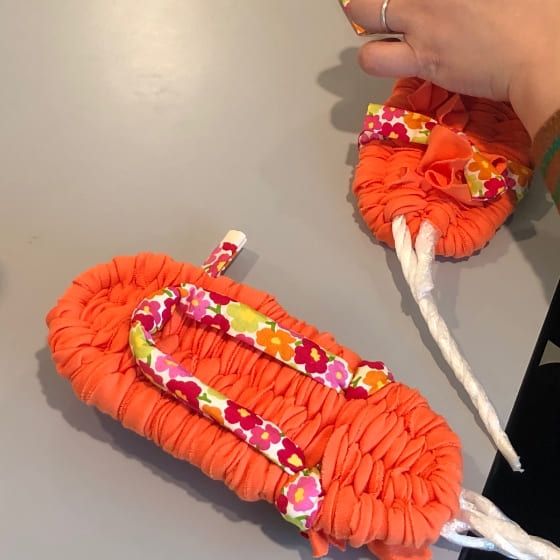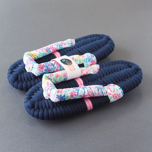ふっくら布ぞうりの会に参加したばかりの新人さんが作った布ぞうり。編み目は少し不揃いですが、履き心地はふっくら布ぞうりと一緒です。この布ぞうりをお買い上げいただくことで初めての編み代が支払われ、新人さんたちの励みになります。